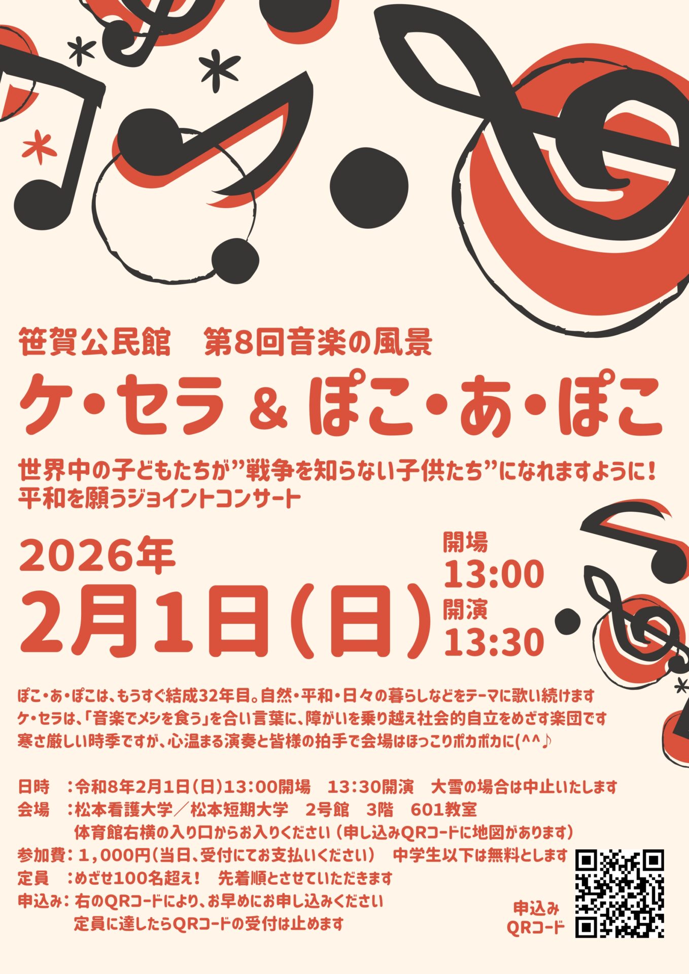 笹賀公民館のイベント「第8回音楽の風景」として、障がいを乗り越え社会的自立をめざす楽団「ケ・セラ」と地元で活動するフォークソンググループ「ぽこ・あ・ぽこ」のジョイントコンサートが、本学を会場として行われることになりました。世界中の子どもたちが“戦争を知らない子どもたち”になれますように!という思いを込めた平和を願うジョイントコンサートです。この機会にお誘いあわせのうえ、是非ご参加ください。